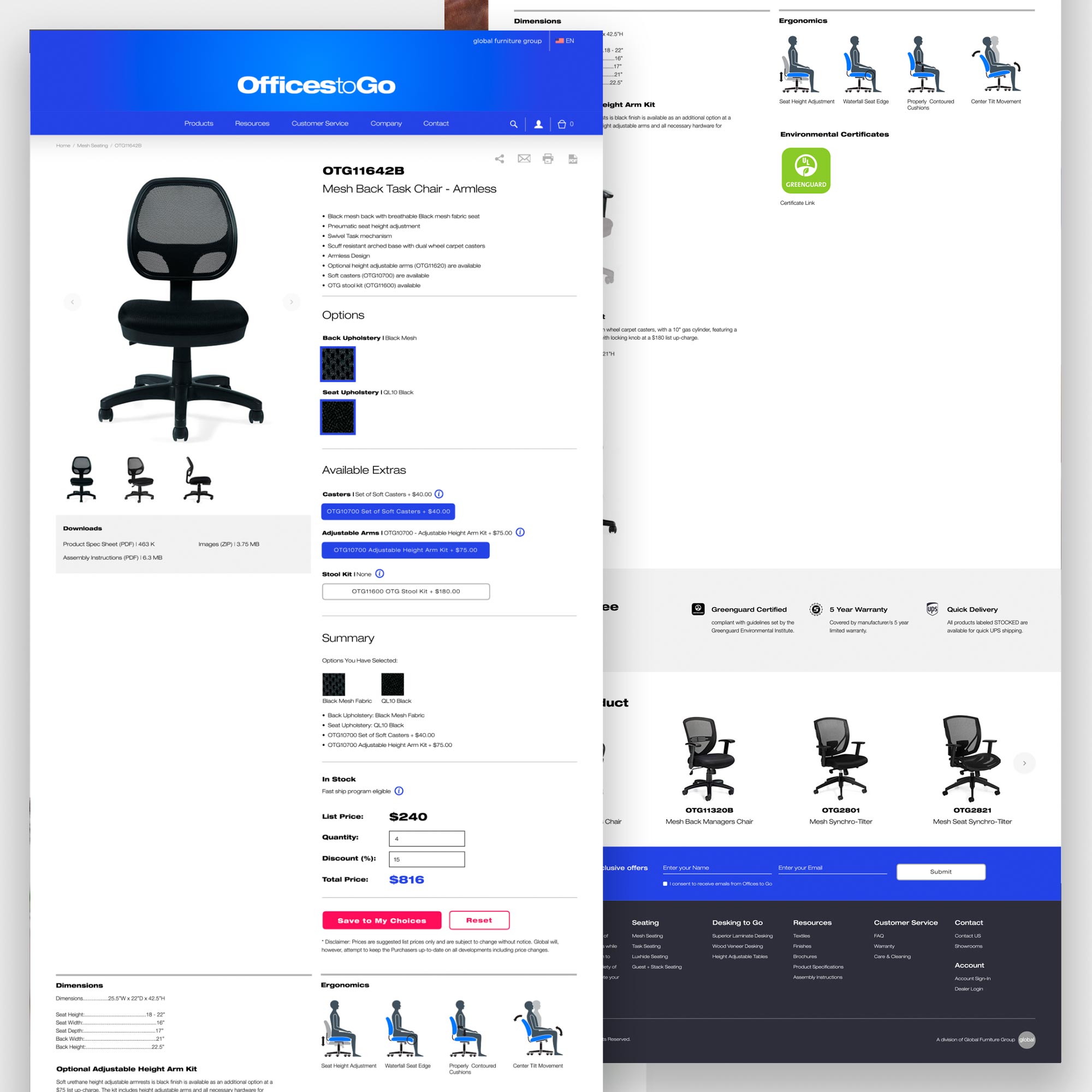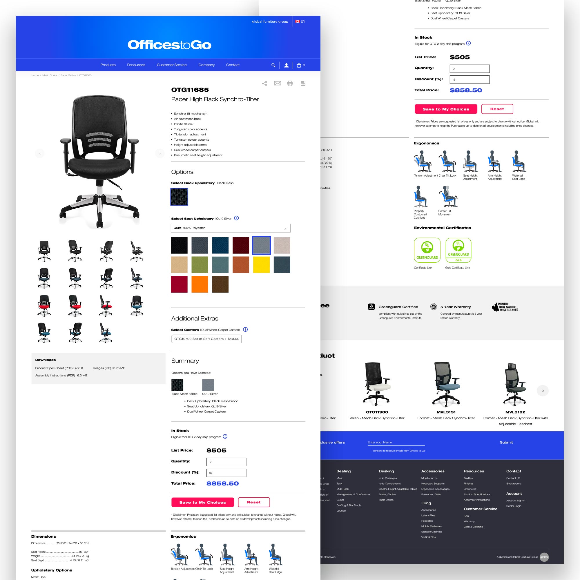 Working in-house at Global Furniture Group as the creative lead for this project, I had the opportunity to develop and manage the digital presence of the OTG brand. The brief directed the user experience to align with the primary Global Furniture Group website, while ensuring it did not surpass it in perceived quality. Clear guidelines were established to present a polished experience while maintaining the inherent character of a value focused brand.