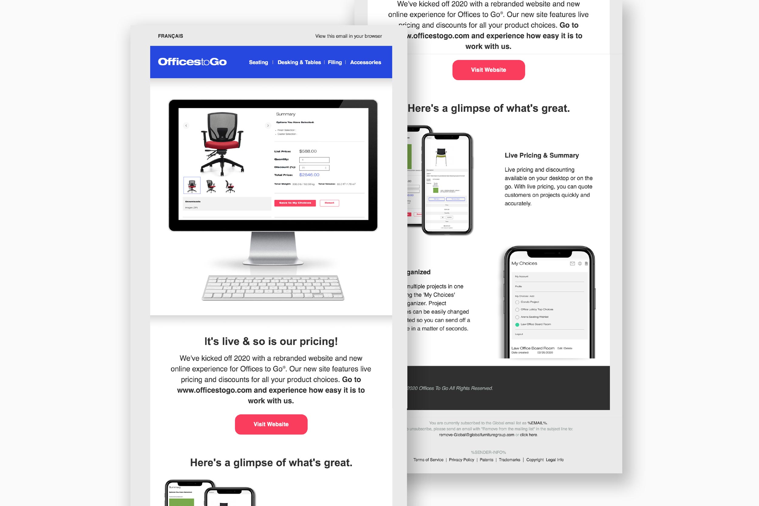 In close collaboration with the Offices To Go marketing team, I supported the continued development of the B2B website by designing on-brand graphics and banners, managing ongoing updates, and maintaining the CMS and centralized photo library. I also designed and custom-coded HTML email marketing campaigns, working alongside marketing to ensure accessibility compliance and fully responsive layouts